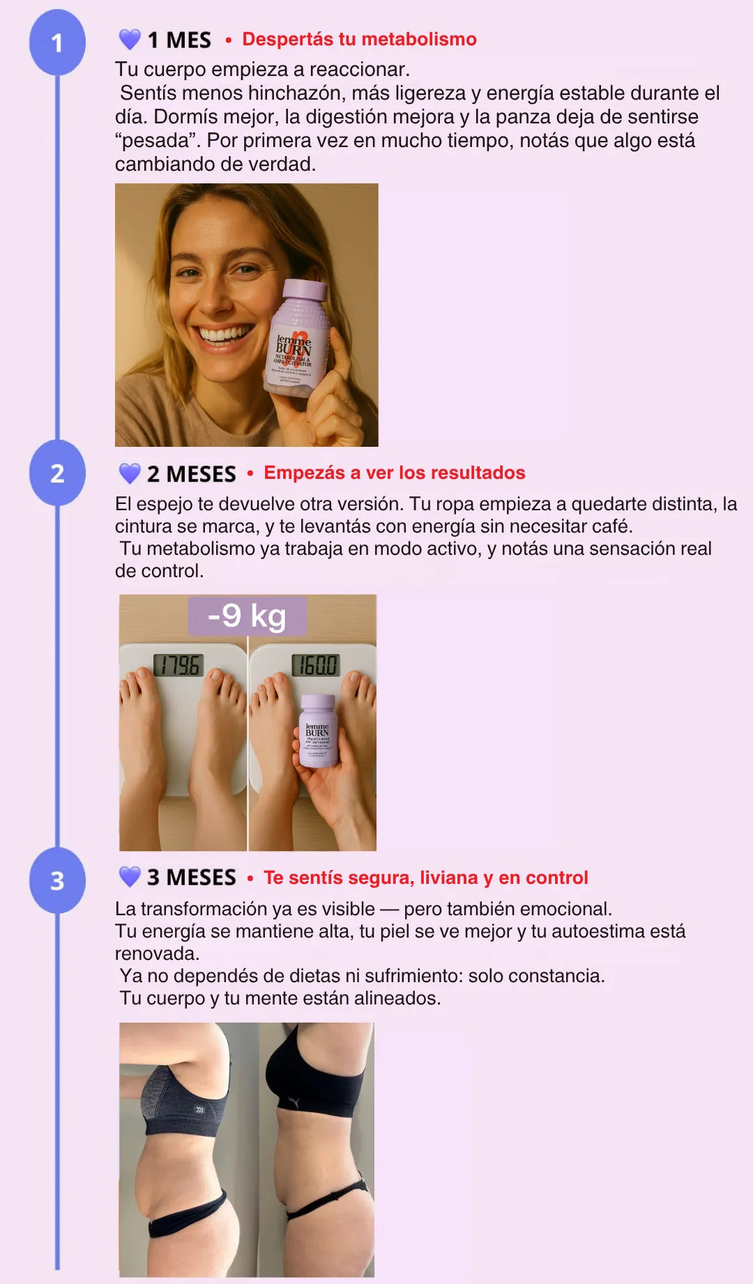 “Sentía que mi metabolismo ya no reaccionaba como antes. Aunque cuidaba mi comida, no veía cambios. Después de integrar Lemme Burn a mi rutina, empecé a sentirme más ligera y menos inflamada. No es algo mágico, pero sí siento que mi cuerpo responde mejor. Lo volvería a comprar sin dudar.”