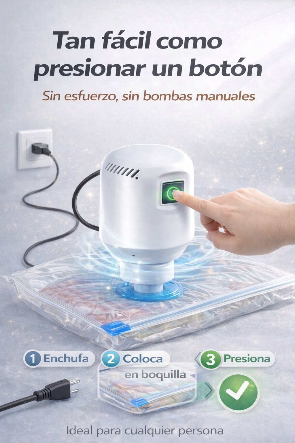 El extractor eléctrico elimina el aire del interior de las bolsas al vacío, compactando ropa, edredones y almohadas de forma rápida y uniforme.